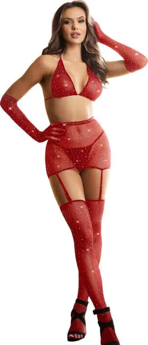 Rohkea ja viettelevä ilme, joka yhdistää eleganssin ja mukavuuden. Tämä verkkobodystocking, jossa on timanttikuvio ja yhteensopivat hanskat, saa sinut tuntemaan itsesi vastustamattomaksi. 88% nailonia ja 12% spandexia sisältävä kangas mukautuu mukavasti erilaisiin siluetteihin.