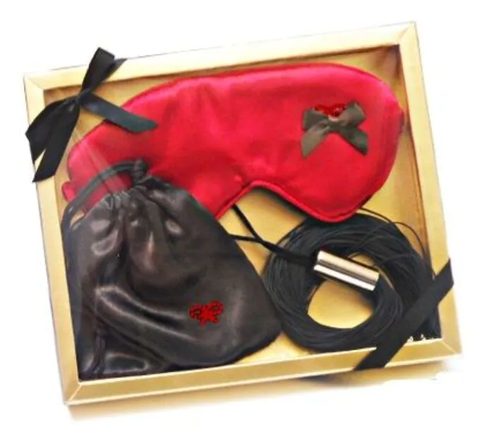 BDSM-setti, joka sisältää látigon, samettisen maskin ja tyylikkään säilytyspussin. Suunniteltu aloittelijoille elegantilla otteella.