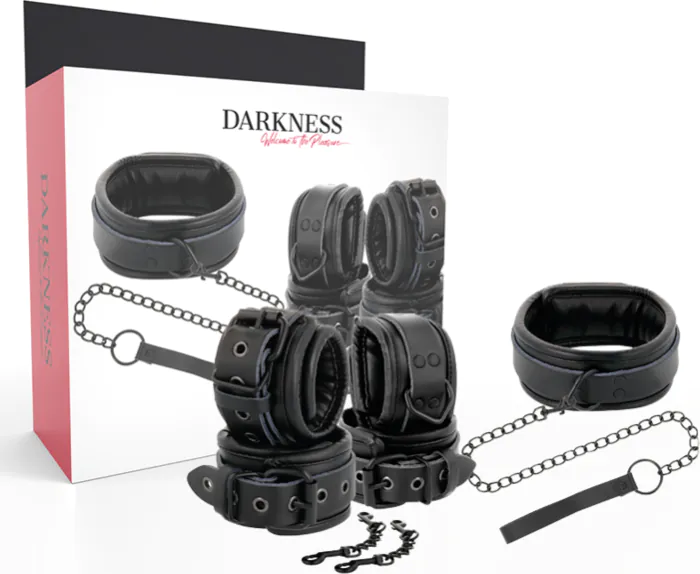 DARKNESS nahka- ja kaulapanta-setti tarjoaa mukavuutta ja turvallisuutta BDSM-leikkeihin. Yksinkertainen säätö tekee siitä helppokäyttöisen sekä aloittelijoille että kokeneille.