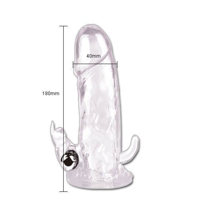 Lisää molempien nautintoa tällä peniksen suojuksella, joka ei ainoastaan lisää pituutta, vaan sisältää myös tehokkaan erillisen klitorisstimulaattorin. 100% ftalaattivapaa TPR-materiaali mukautuu mihin tahansa kokoon ja tarjoaa realistisen tunteen. Klitoriksen ja perineumin värisevä stimulaattori antaa sinun tutkia uusia nautinnon intensiivisyyksiä.