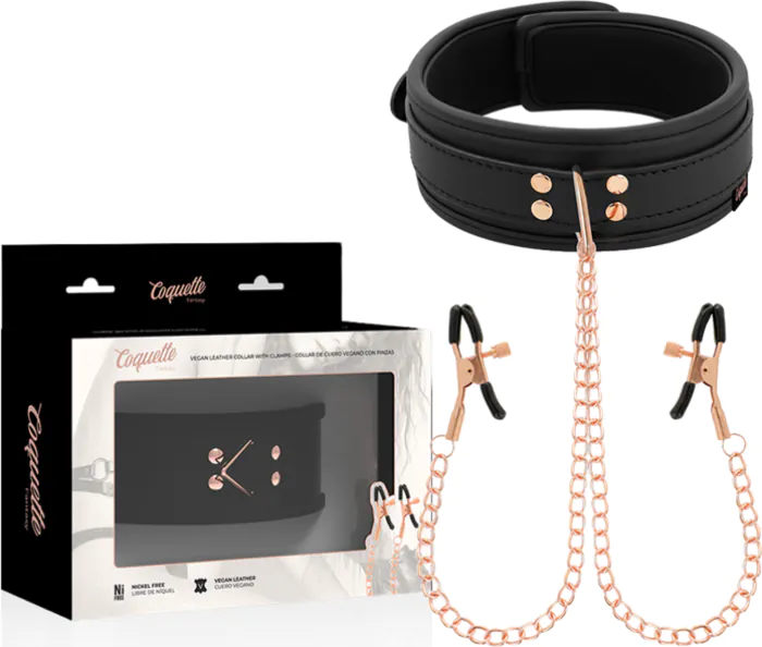 Vahvaa ja pehmeää vegaanista nahkaa, joka kattaa mukautuvan kaulaketjun, joka tarjoilee täydellistä erityisyyttä ja mukautuntaa kokemukseen. Mukana olevat nipistimet tarjoavat juuri sopivan määrän jännitettä, joka syventää nautintoa. Tämän lisäksi kaulaketjussa on vahva rengas, johon voit liittää hihnan, jolloin se on täydellinen valinta niin aloittelijoille kuin jo kokemusta omaaville BDSM-harrastajille.