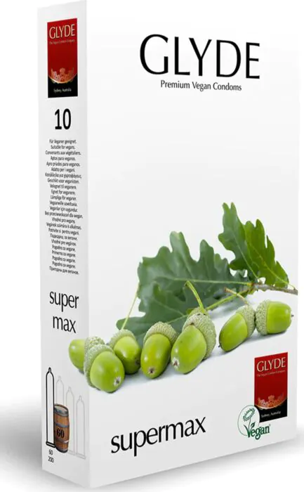 Glyde Ultra Supermax -kondomeilla voit nauttia mukavasta ja turvallisesta yhdynnästä. Suunniteltu suurille peniksille, nämä kondomit ovat valmistettu luonnonkumista ja ne ovat 100% vegaanisia. Varmista miellyttävä kokemus käyttämällä vesipohjaista liukuvoidetta.