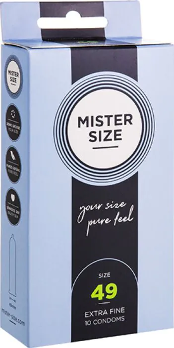 MISTER SIZE 49 mm kondomit tarjoavat optimaalisen istuvuuden ja intensiivisen tunteen. Ne on suunniteltu erityisesti hieman kapeammille peniksille varmistaen mukautuvan suojan.