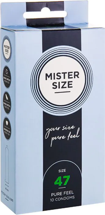 Kondomit MISTER SIZE 47 mm tarjoavat turvallista suojaa ja intensiivistä tunnetta. Erityisesti kapeammille peniksille suunniteltu malli.