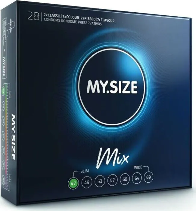 Kondomi MY SIZE MIX 47 mm tarjoaa mukavuutta ja herkkyyttä. Nauti intiimistä hetkestä erilaisilla vaihtoehdoilla, jotka sopivat jokaiselle.