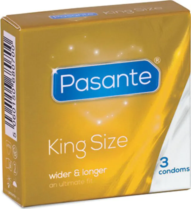Mukavuus ja turvallisuus yhdistyvät Pasante King MS kondomeissa, joissa on pidempi ja leveämpi muotoilu. Niiden pituus 205 mm ja leveys 60 mm tekevät niistä erityisen miellyttäviä käyttää ilman puristusta. Kondomit eivät kuitenkaan ole liukastettuja, joten suositellaan liukuvoiteen käyttöä vedenpohjalta.