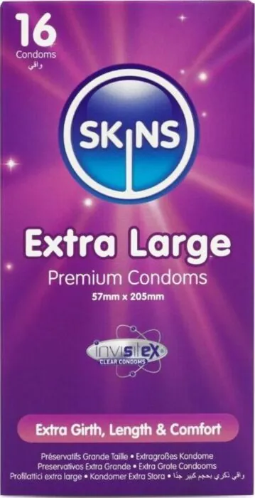 Skins XL -kondomit on suunniteltu mukautumaan paremmin suurempikokoisille. Ne tarjoavat erinomaisen luonnollisen tunteen ja ylimääräisen voitelun.