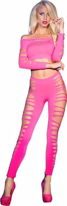 Setti, joka säteilee mukavuutta ja viehättävyyttä strategisesti sijoitettujen aukkojen ansiosta. Tämä Chilirose-toppi ja legginsit, jotka on valmistettu pehmeästä nailonista ja elastaanista, mukautuvat kehoosi, tarjoten liikkumisvapauden ja sensuellin kosketuksen.
