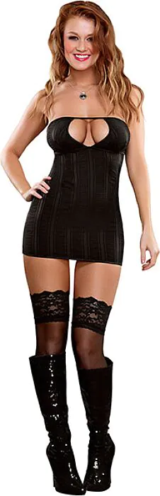 Herätä viettelykyky Keyhole Chemise -mekolla Exposedilta. Sen lyhyt ja rohkea muotoilu yhdessä pehmeän mustan kankaan, jossa on kohokuvioita, saa sinut tuntemaan itsesi vastustamattomaksi. Mekko kiinnitetään mukavasti selästä, mikä mahdollistaa suositeltavan istuvuuden.