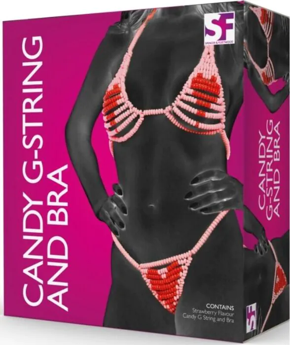 Yhdistelmä, joka yhdistää hauskuuden ja sensuaalisuuden: karkkibrassi ja -stringit vievät sinut lapsuuteen hedelmäisen makunsa ja rohkean muotoilunsa ansiosta. Valmistettu värikkäistä ja syötävistä karkkikoruista, tämä setti tuo leikkisän käänteen erityisiin hetkiisi.