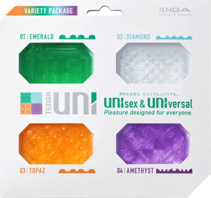 TENGA UNI VARIETY PACK tarjoaa neljä erilaista sienten stimulaatiota. Tämä unisex-masturbaattori sopii sekä yksin että parin kanssa käytettäväksi.