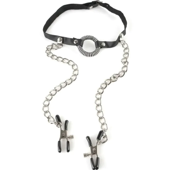 Aseta mordaza suun ympärille ja kiinnitä pinsetit nänneihin, säätämällä jännitettä renkaan avulla. Suosittelemme käyttämään vesipohjaista liukuvoidetta mukavuuden lisäämiseksi.