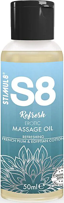 STIMUL8 S8 Refresh -öljy on ihanteellinen kumppani rentouttaviin hierontoihin. Yhdistelmä jojoba-, manteli- ja seesamiöljyä tarjoaa kestävää liukuvoimaa ja syviä hedelmäisiä tuoksuja, jotka tekevät kokemuksesta nautinnollisen. Voit käyttää tätä öljyä sekä intiimissä että yleisessä hieronnassa.