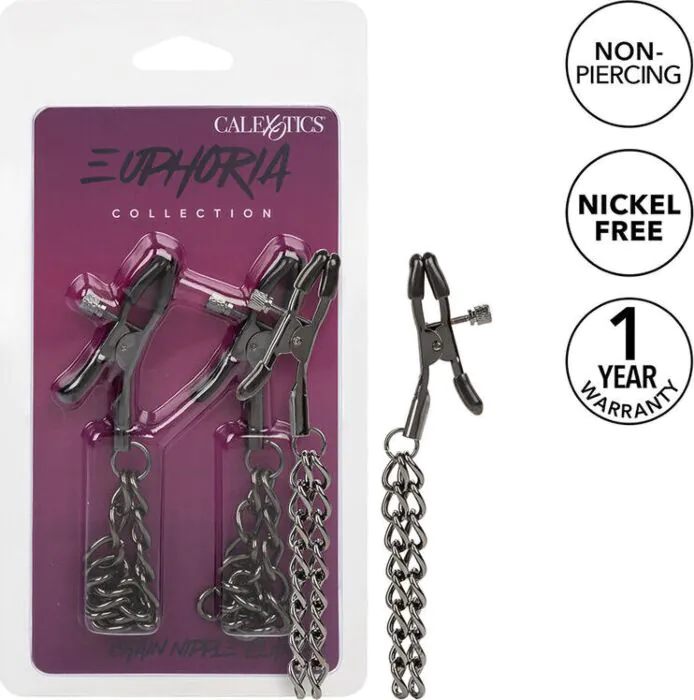 Intensiivinen ja henkilökohtainen stimulaatio pinnoilla, jotka on varustettu pehmeillä tyynyillä. CALEXOTICS EUPHORIA -pinssit tarjoavat mukautuvaa mukavuutta, ja kaksinkertaiset ketjut lisäävät jännitystä jokaisessa liikkeessä. Ne on valmistettu nikkelivapaasta metallista, joten voit nauttia ilman huolia.