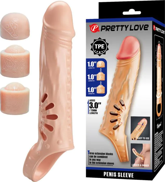 Lisää nautintoa ja intensiivisyyttä penetraation aikana Pretty Love -peniksen suojuksen avulla. Valmistettu pehmeästä ja joustavasta premium TPE:stä, se tarjoaa stimuloivan tekstuurin, joka korostaa jokaista liikettä. Kolmen irrotettavan pidennyksen ansiosta voit pidentää sitä jopa 7,5 cm, mukautuen mieltymyksiisi ja tarpeisiisi.