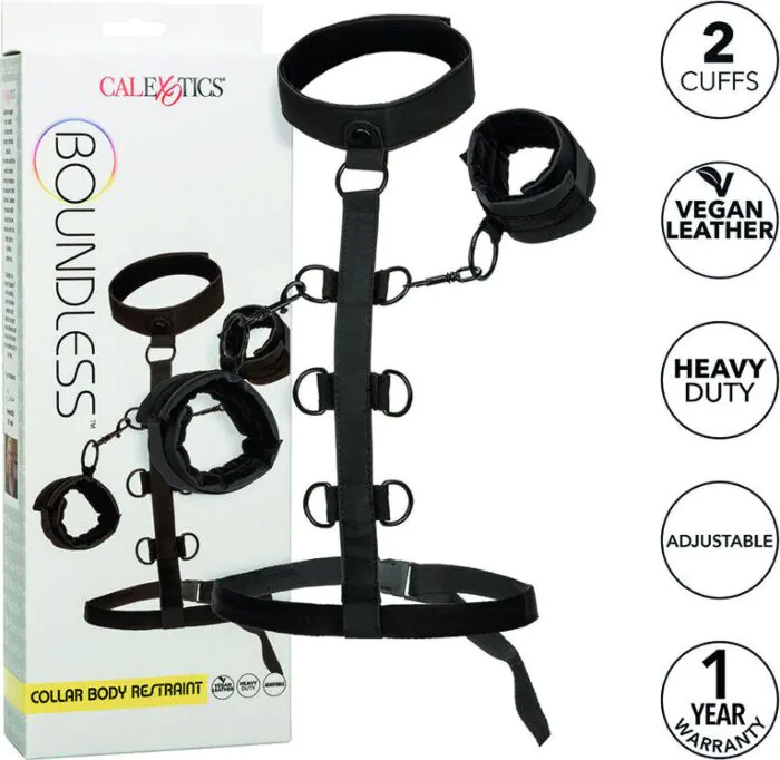 Luo ainutlaatuista intensiivistä tunnelmaa bondage-leikkeihin mukautuvilla CALEXOTICS Boundless -valjailla. Valjaat on valmistettu vegaanisesta nahasta, mikä tekee niistä kestävät ja mukavat käyttää. Irrotettavat hihat tarjoavat mahdollisuuden erilaisiin leikkeihin ja käyttöön erikseen, tarjoten lisävaihtoehtoja ja mukautumista leikkeihisi.