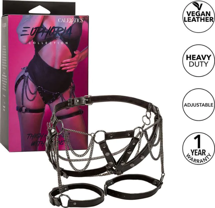 Rohkea valjaat Euphoria, jossa on kestäviä metalliketjuja. Mukautuvat hihnat takaavat mukavan ja turvallisen istuvuuden useimmille. Loistava valinta niille, jotka haluavat kokeilla uusia puolia seksuaalisuudestaan.