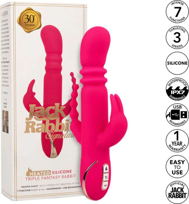 Lämpö ja värinä kohtaavat CALEXOTICSin Jack Fantasy -kanin väristimessä. Sen lämmitettävä akseli saavuttaa maksimaalisen lämpötilan vain 4 minuutissa, joten nautit ainutlaatuisesta aistielämyksestä. Lisäksi sen seitsemän värinätoimintoa ja voimakas ylös- ja alaspäin liikkuva liike tekevät siitä välttämättömän osan intiimilelujen kokoelmaasi.