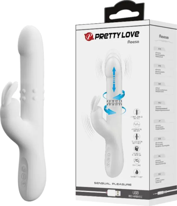 Tehokas kaksinkertainen stimulaatio yhdistää klitoriksen ja G-pisteen herkkyyden 12 värinätilan ja 4 rotaatiosuunnan avulla. Pretty Love Reesen sileä ja pehmeä rakenne mukautuu täydellisesti naisen anatomiaan.